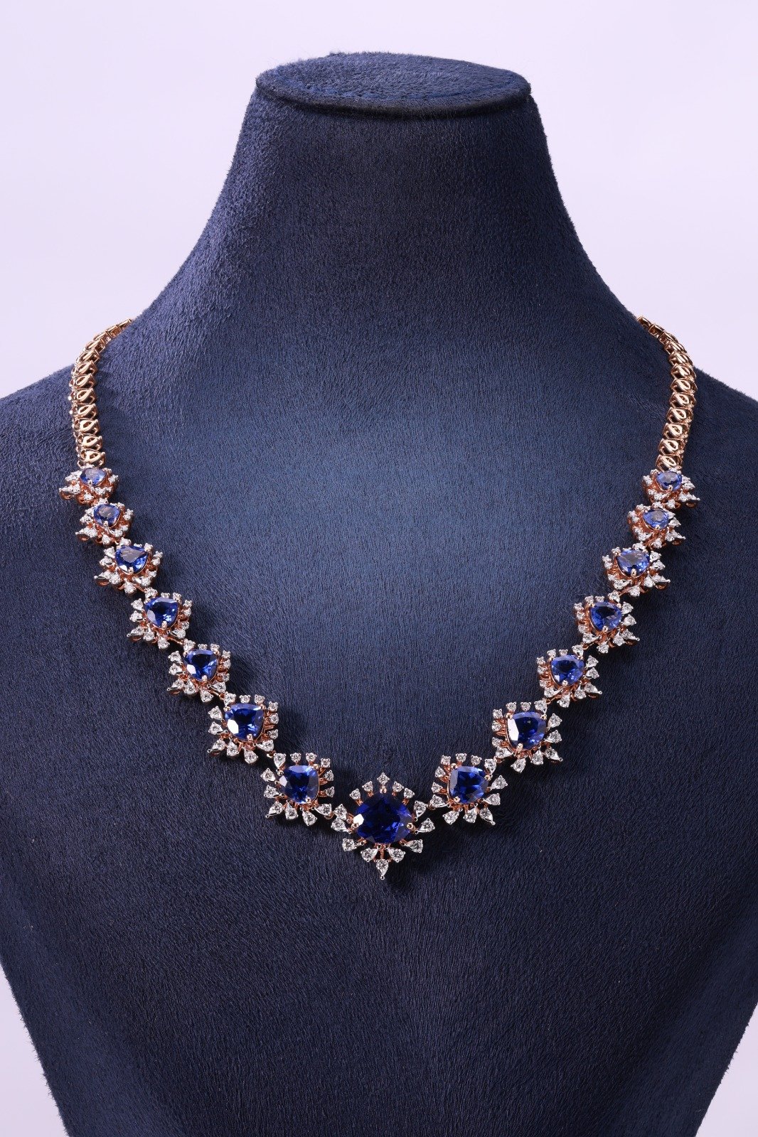 Crafted to highlight the contrast between deep sapphire hues and radiant diamonds, the design flows beautifully around the neckline, making it ideal for both special occasions and refined evening wear. With 2.16 carats of diamonds, this necklace offers a perfect balance of luxury and wearability.